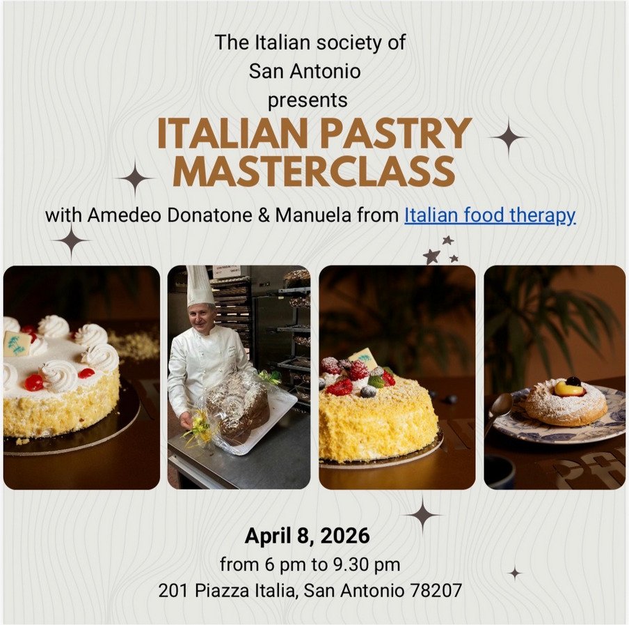Italian Pastry Masterclass Wednesday, April 8, 2026 6:00 PM 9:30 PM Italian Society 201 Piazza Italia San Antonio, TX, 78207 (map) Google Calendar ICS Bakers - Please join us for this EXCLUSIVE one-night hands on course in classic Italian Pastries. Each participant makes and takes home a full cake + pastries. Limited to 10 Participants.Learn to make:Mimosa CakeProfiterolesAssorted Pastries ORDER ORDER